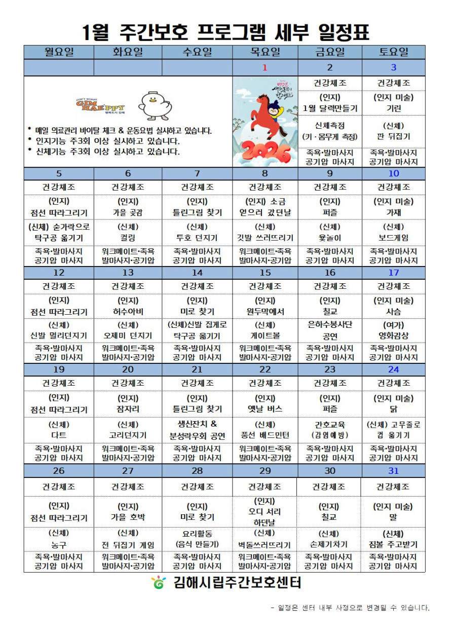 김해시립주간보호센터 1월 프로그램 일정표 작성자 관리자 댓글 0건 조회 8회 작성일 2025-12-31 본문 김해시립주간보호센터 1월 프로그램일정표입니다. 목록 다음글김해시립요양원(일반실) 1월 프로그램 일정표 25.12.31