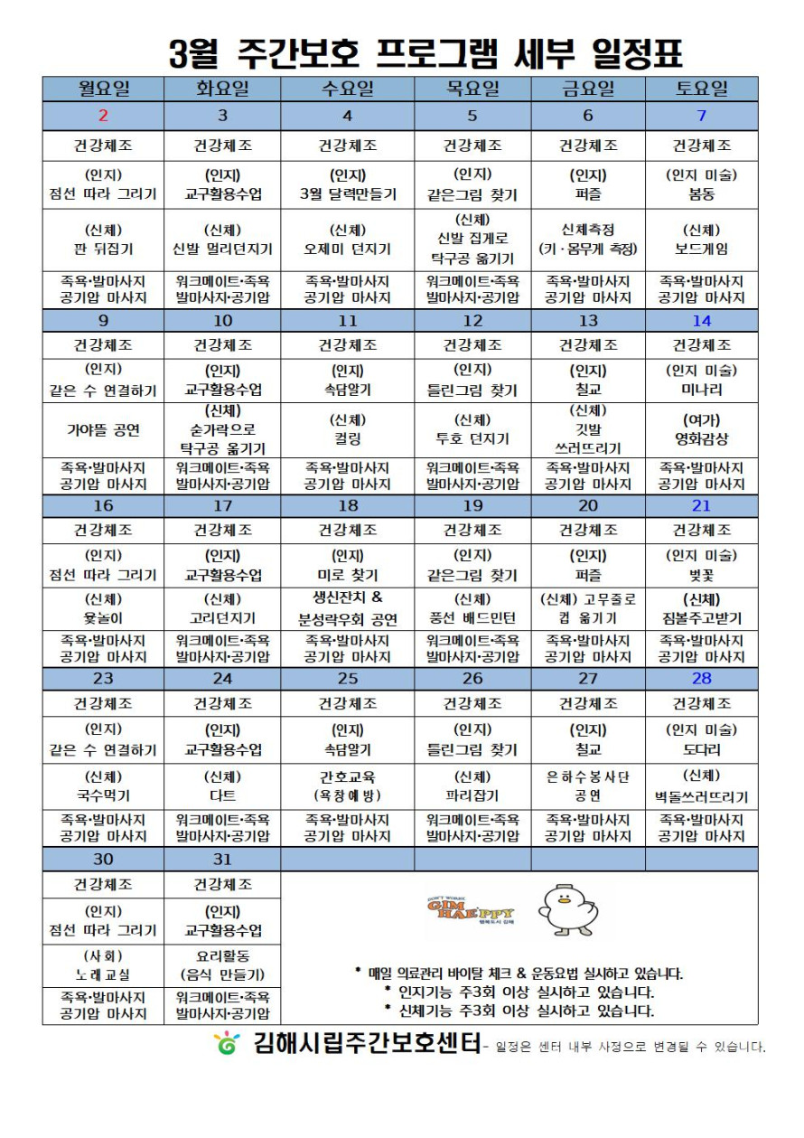 김해시립주간보호센터 3월 프로그램 일정표 작성자 관리자 댓글 0건 조회 91회 작성일 2026-02-28 본문 김해시립주간보호센터 3월 프로그램일정표입니다. 목록 다음글김해시립요양원 3월 물리치료 프로그램 일정표 25.04.30