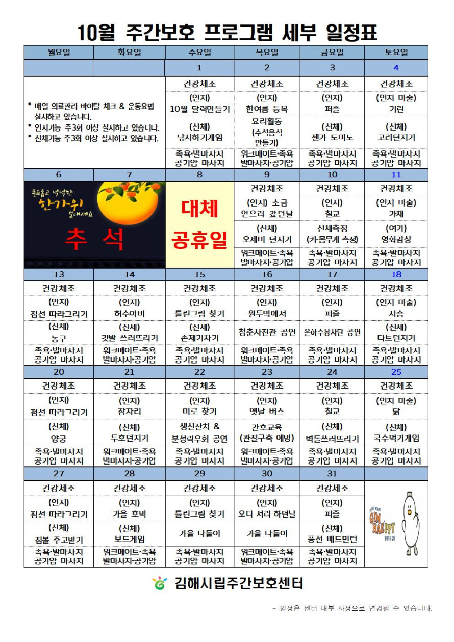 김해시립주간보호센터 10월 프로그램 일정표