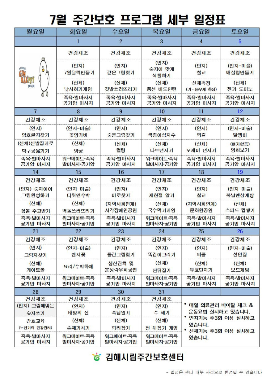 김해시립주간보호센터 7월 프로그램일정표입니다