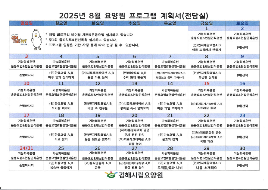 김해시립요양원(전담실) 8월 프로그램 일정표