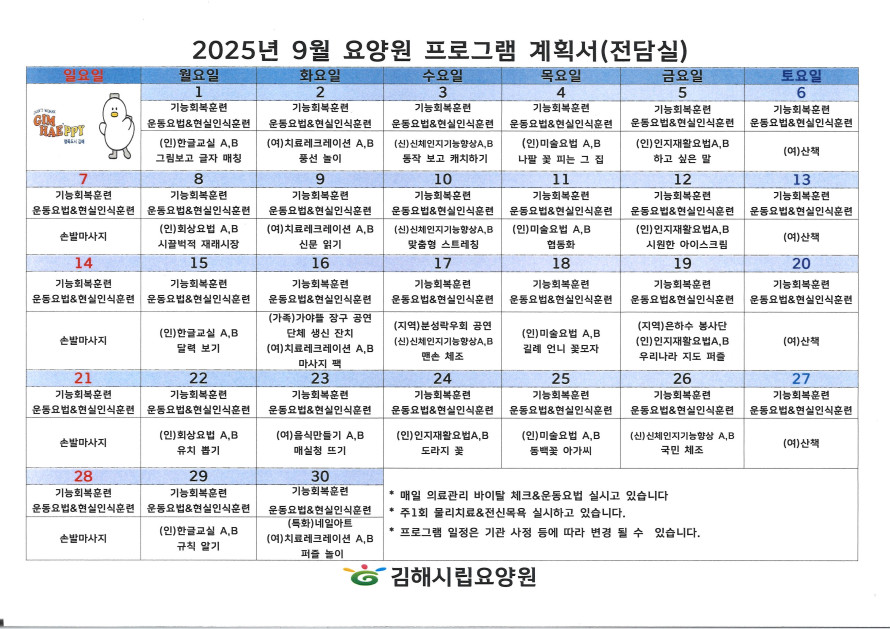 김해시립요양원(전담실) 9월 프로그램 일정표