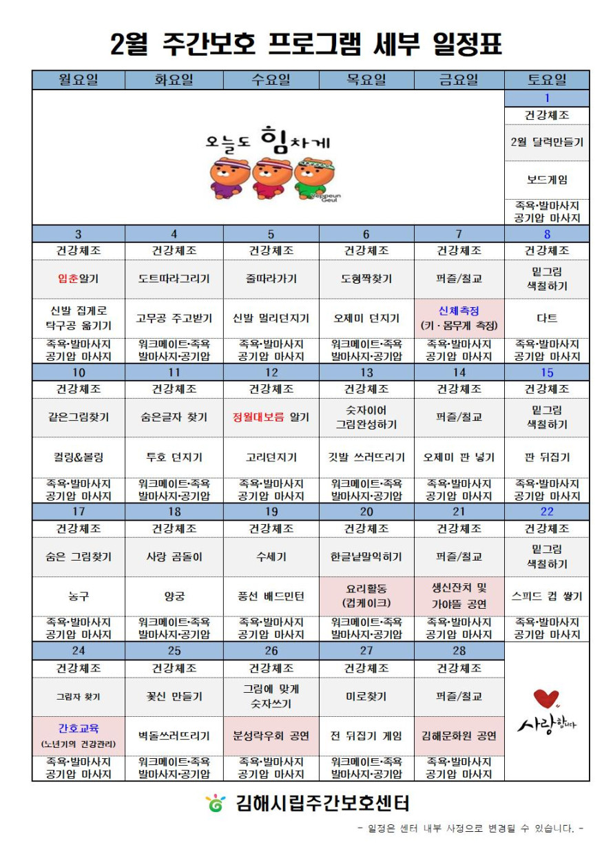 김해시립주간보호센터 2025년 2월 프로그램 일정표입니다~