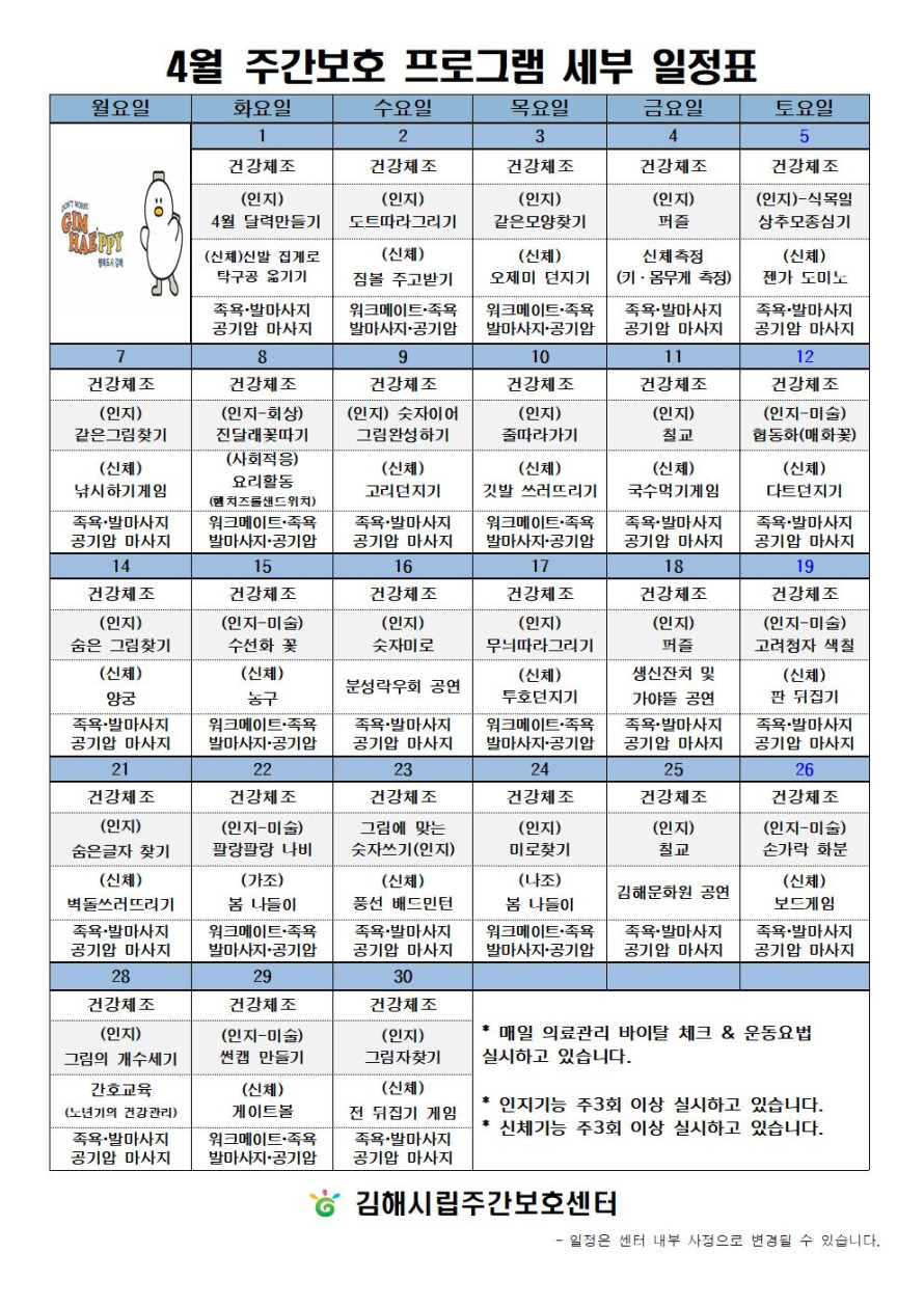김해시립주간보호센터 4월 프로그램 일정표