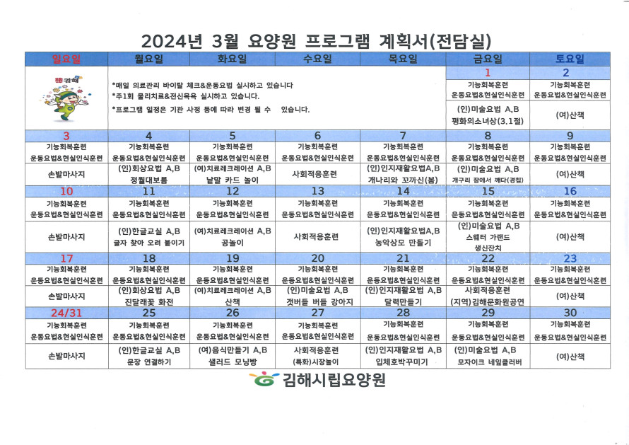 김해시립요양원(전담실) 3월 프로그램 일정표