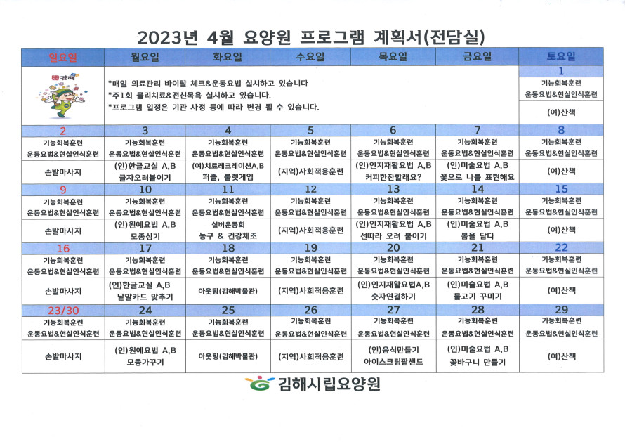 김해시립요양원(전담실) 4월 프로그램 일정표