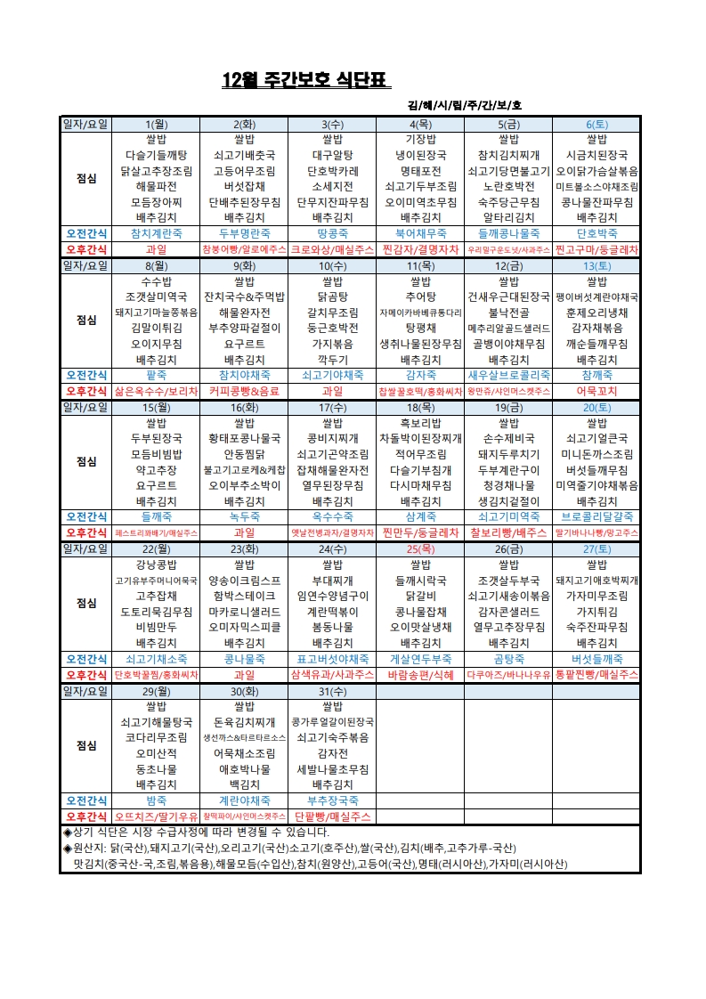 김해시립주간보호센터 12월 식단표 작성자 관리자 댓글 0건 조회 233회 작성일 2025-11-28 본문 김해시립주간보호센터 12월 식단표입니다. 목록 이전글김해시립요양원 12월 2주 식단표 25.12.04 다음글김해시립요양원 12월 1주 식단표 25.11.27