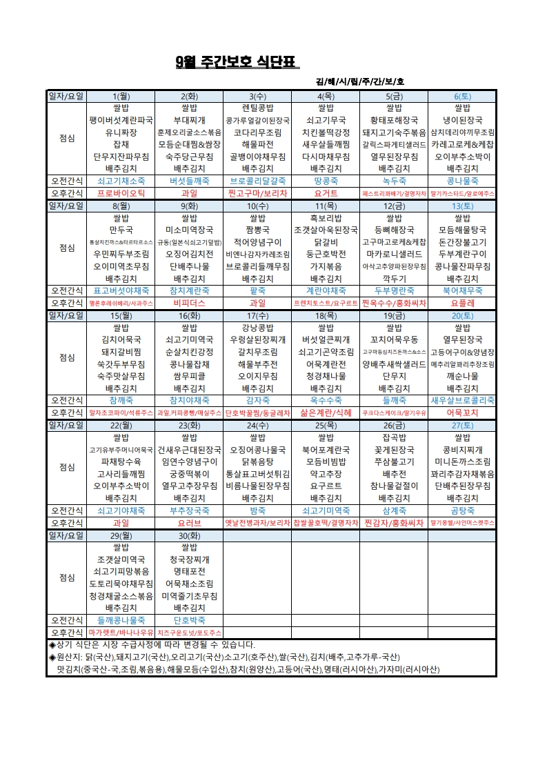 김해시립주간보호센터 9월 식단표 작성자 관리자 댓글 0건 조회 463회 작성일 2025-08-29 본문 김해시립주간보호센터 9월 식단표입니다. 목록 이전글김해시립요양원 9월 2주 식단표 25.09.04 다음글김해시립요양원 9월 1주 식단표 25.08.28