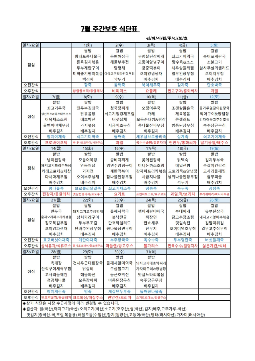 김해시립주간보호센터 7월 식단표 작성자 관리자 댓글 0건 조회 591회 작성일 2025-06-28 본문 김해시립주간보호센터 7월 식단표입니다 목록 이전글김해시립요양원 7월 2주 식단표 25.07.03 다음글김해시립요양원 7월 1주 식단표 25.06.27