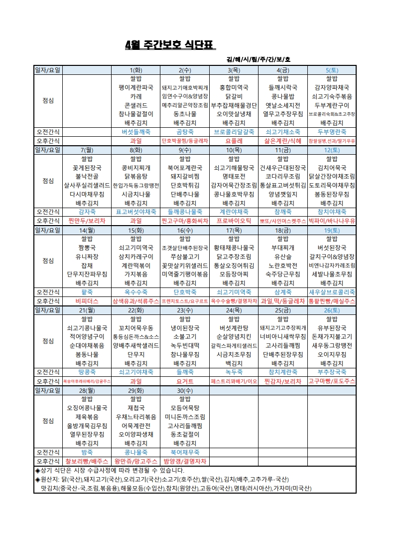 김해시립주간보호센터 4월 식단표 작성자 관리자 댓글 0건 조회 698회 작성일 2025-03-31 본문 김해시립주간보호센터 4월 식단표 목록 이전글김해시립요양원 4월 1주 식단표 25.04.04 다음글김해시립요양원 3월 5주 식단표 25.03.28