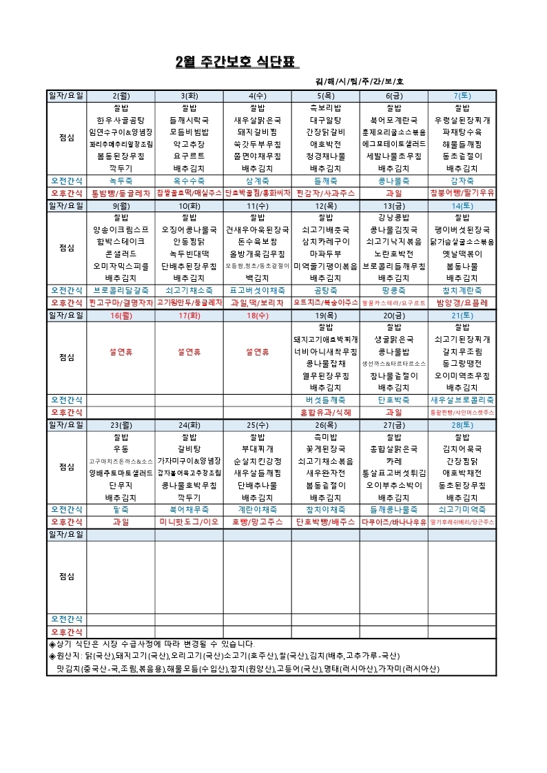 김해시립주간보호센터 2월 식단표 작성자 관리자 댓글 0건 조회 141회 작성일 2026-01-30 본문 김해시립주간보호센터 2월 식단표입니다. 목록 이전글김해시립요양원 2월 2주 식단표 26.02.05 다음글김해시립요양원 2월 1주 식단표 26.01.30