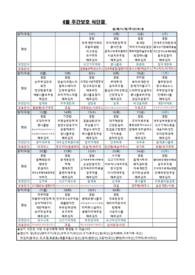 김해시립주간보호센터 4월 식단표 작성자 관리자 댓글 0건 조회 5회 작성일 2026-04-03 본문 김해시립주간보호센터 4월 식단표입니다. 목록 다음글김해시립요양원 4월 1주 식단표 26.04.02