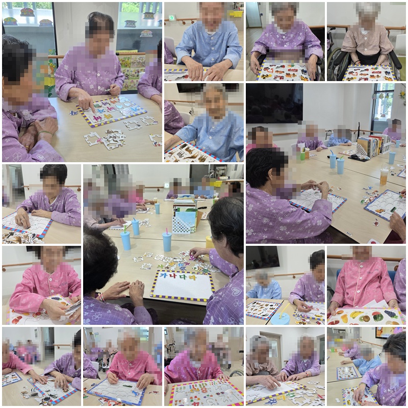 어르신들과, 과일, 탈 것, 숫자, 동물, 한글 퍼즐을 맞추어 완성해 보는 시간을 가졌습니다. ~^^