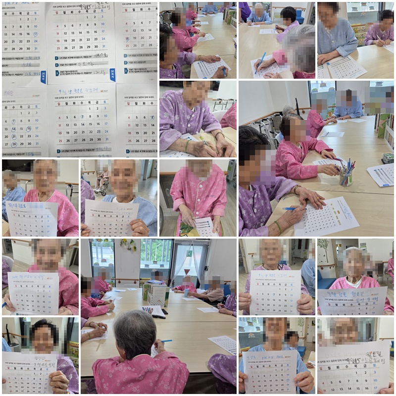 어르신들과 달력에 잇는 요일, 숫자를 매칭하여 읽어보고 지문에 맞는 답을 써보는 시간을 가졌습니다. ~^^
