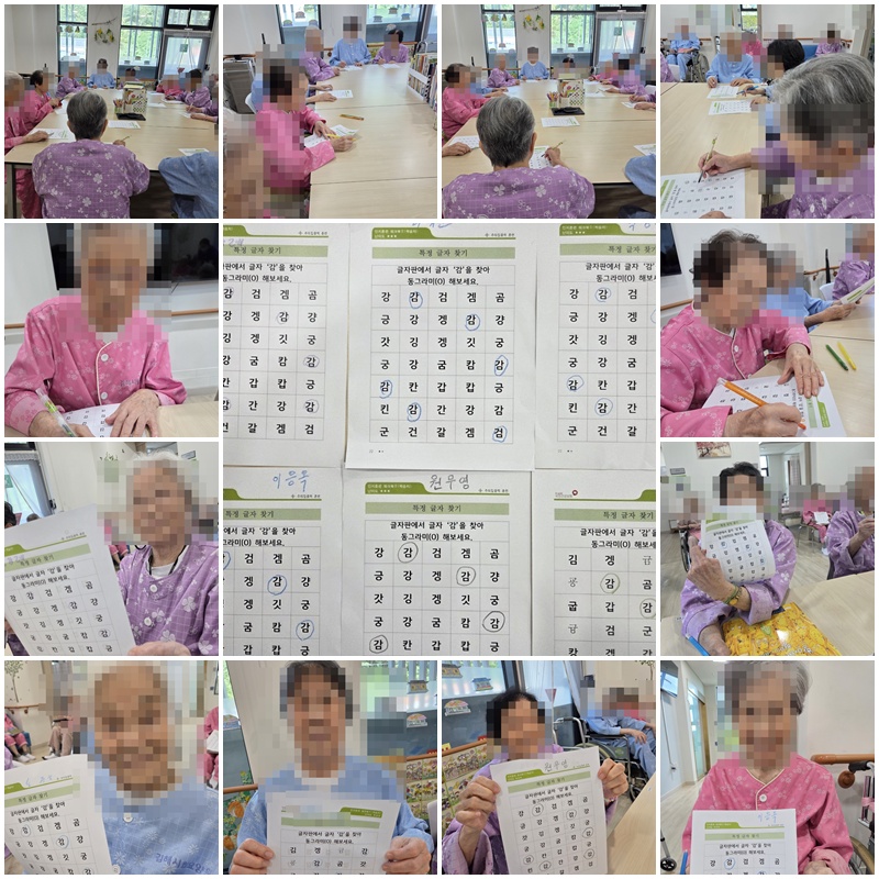 어르신들과 팀 별로 나누어 '특정 글자 빨리 찾기' 게임을 하며 활동지를 완성해 보았습니다. ~^^