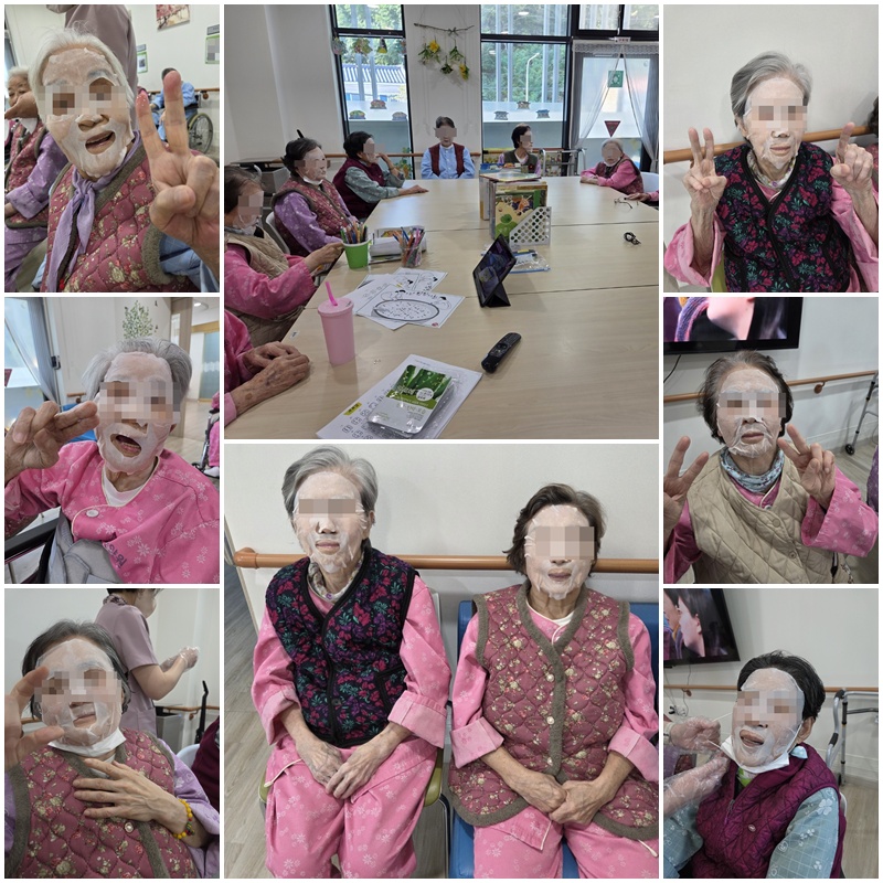 어르신들과 레크레이션 프로그램으로 팩으로 얼굴 관리를 해보는 시간을 가졌습니다. ~^^