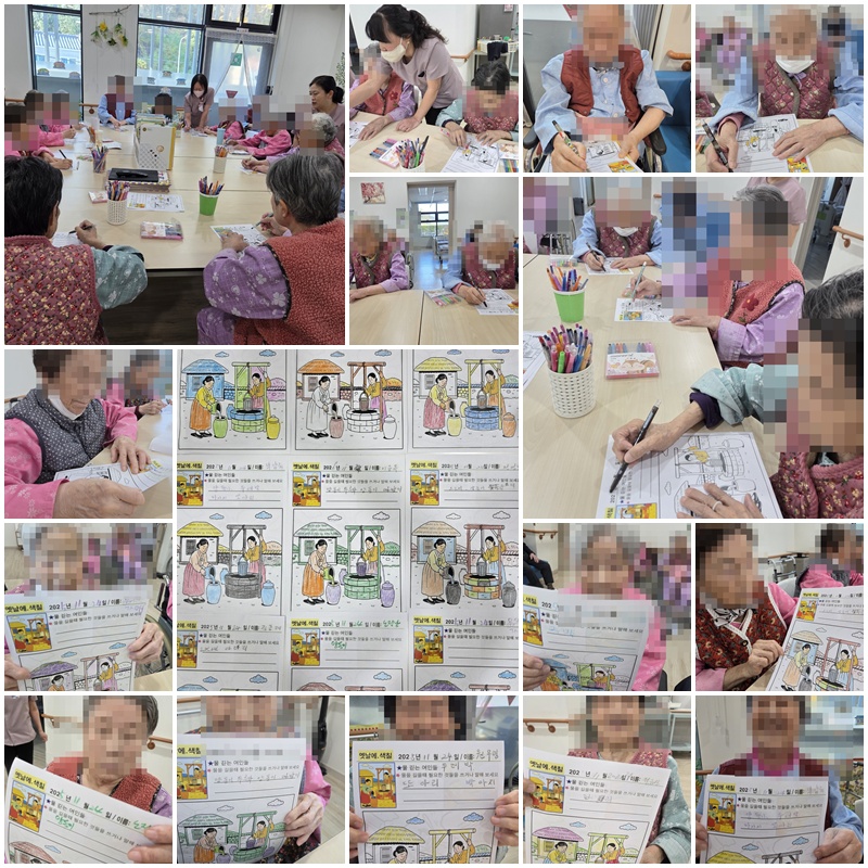 어르신들과 물 긷는 여인들 활동지를 해보며 우물가에 관련된 이야기를 해보는 시간을 가졌습니다. ~^^