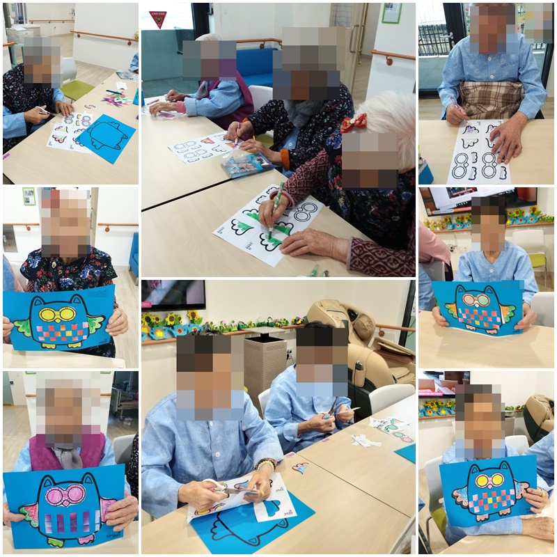 어르신들과 미술 프로그램으로 부엉이를 만들어 보았습니다. 오리고 붙이고 ♬♪ 즐거운 시간을 보내셨습니다.