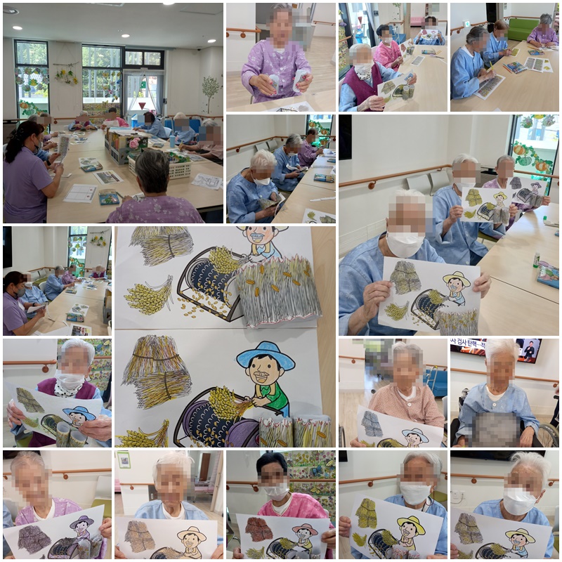 어르신들과 가을 추수와 관련된 이야기를 하며 탈곡과 볖짚 묶기 활동지를 완성해보는 시간을 가졌습니다. ~^^