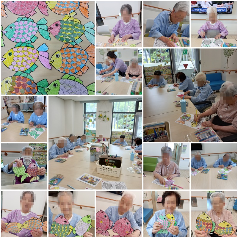 어르신들과 황금 물고기를 알록달록하게 꾸며 창문에 붙여보는 시간을 가졌습니다.~^^