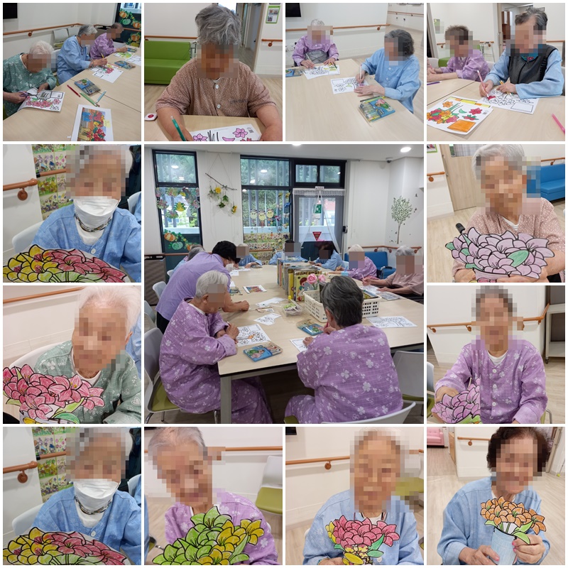 어르신들과 활동지 꽃병을 색칠하며 입체적으로 꾸며보는 시간을 가졌습니다. ~^^