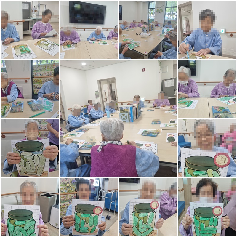 어르신들과 오이 피클 색칠하며 활동지를 완성해 보는 시간을 가졌습니다.