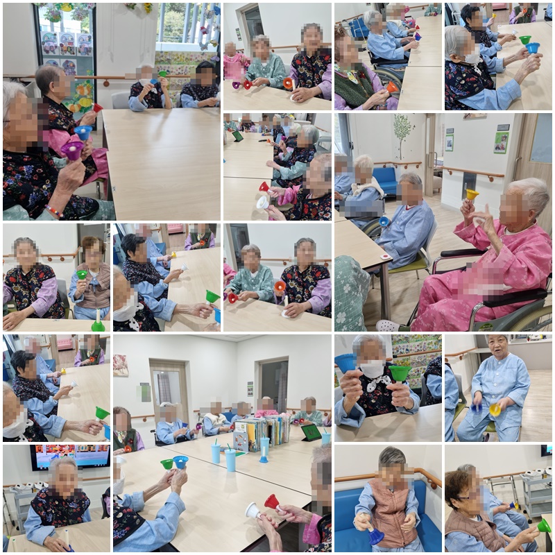 어르신들과 동요, 트로트 노래에 맞춰 핸드벨을 흔들며 즐거운 시간을 보냈습니다. ~^^♩♪♬