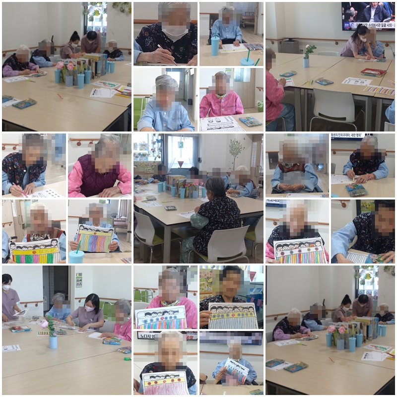 어르신들과 '그때 그 시절' 이야기를 하며 색동 이불 속 육남매 활동지를 완성해 보는 시간을 가졌습니다. ~^^