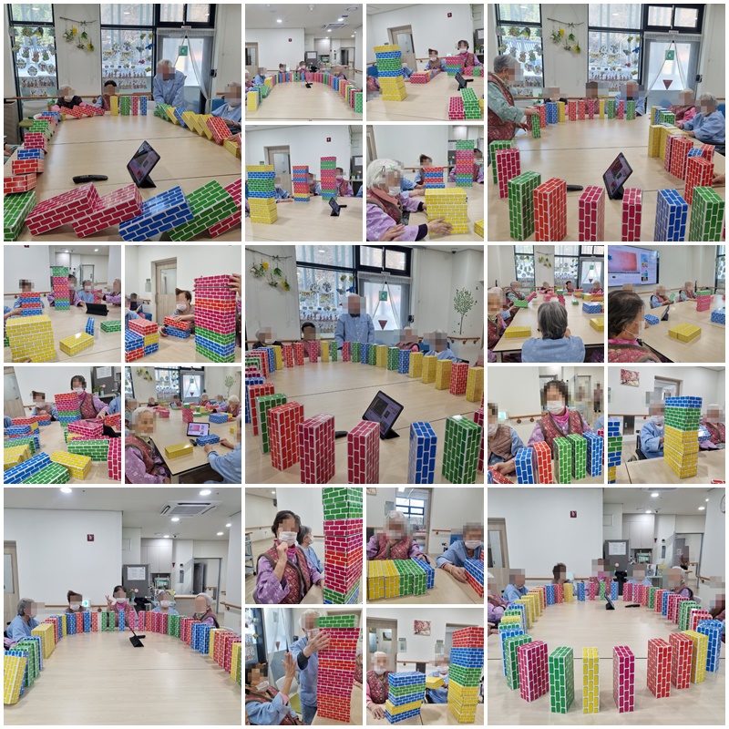 어르신들과 종이 벽돌 쌓기, 동그라미 만들기, 도미노 게임을 팀 별로 진행하며 즐거운 시간을 보냈습니다.