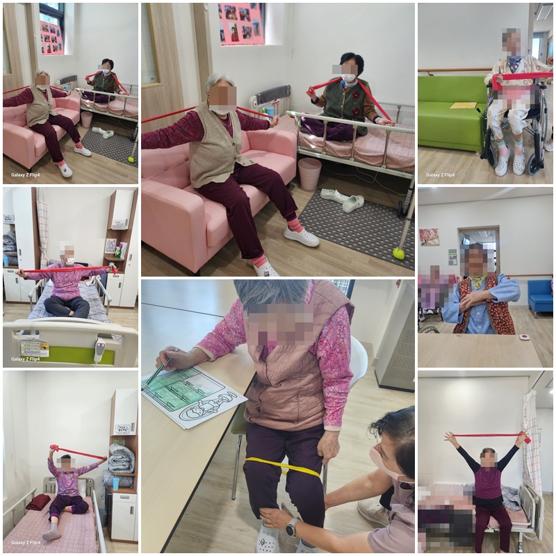 어르신들과 탄성밴드를 이용하여 여러가지 스트레칭 동작을 따라 해보는 시간을 가졌습니다. ~^^