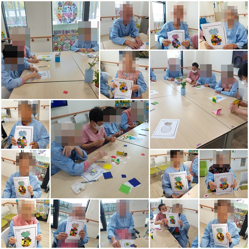 어르신들과 파인애플 과일을 꾸며보는 시간을 가졌습니다. 오리고 붙이고~ ♩♪♬ 즐거운 시간을 보냈습니다.