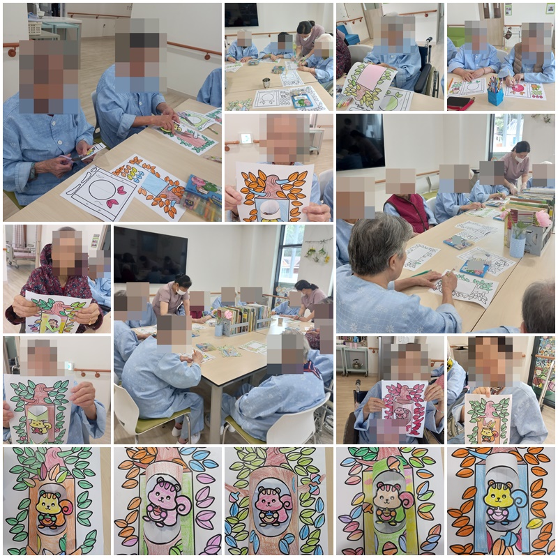 어르신들과 도토리 먹는 다람쥐 색칠하여 나무에 붙이기를 해보았습니다. ~^^
