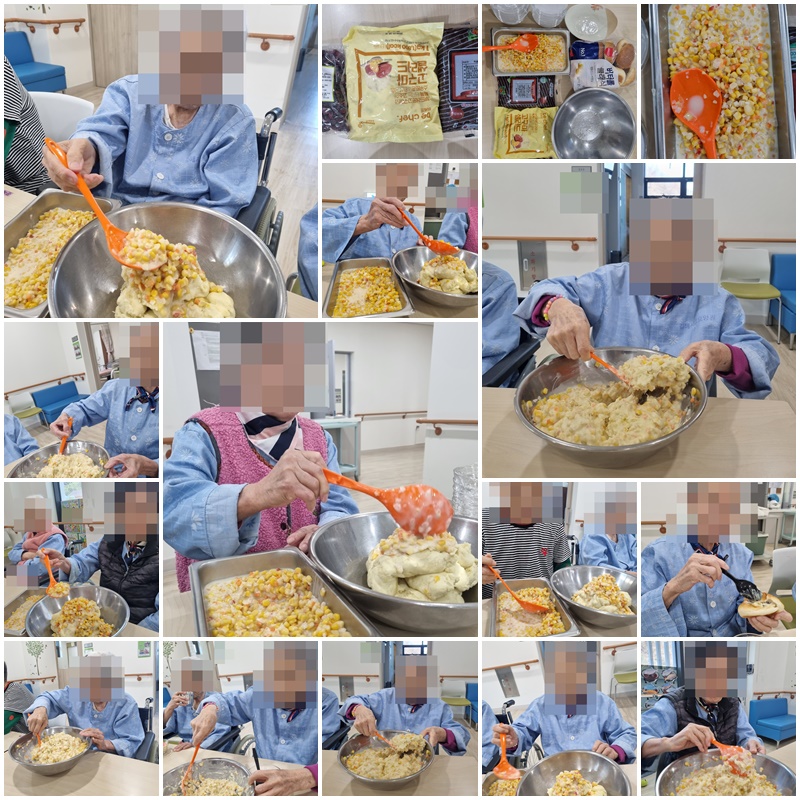어르신들과 부드러운 고구마무스를 만들어 보는 시간을 가졌습니다. 건포도, 옥수수 콘을 넣어 풍성한 고구마무스를 만들어 빵과 함께 먹어보는 시간을 가졌습니다~^^
