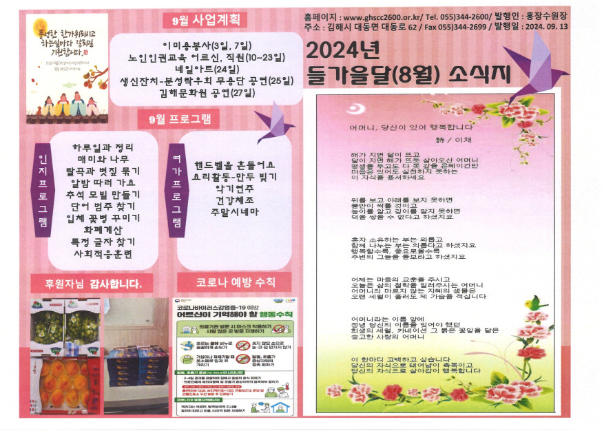 2024년 들가을달(8월) 소식지 작성자 관리자 댓글 0건 조회 204회 작성일 24-09-13 11:13 본문 2024년 들가을달(8월) 소식지 목록 이전글2024년 온가을달(9월) 소식지 24.10.14 다음글2024년 더위달(7월) 소식지 24.08.19