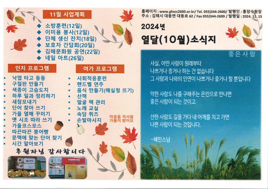 2024년 열달(10월) 소식지 작성자 관리자 댓글 0건 조회 186회 작성일 24-11-15 09:05 본문 2024년 열달(10월) 소식지 목록 이전글2024년 들겨울달(11월) 소식지 24.12.16 다음글2024년 온가을달(9월) 소식지 24.10.14