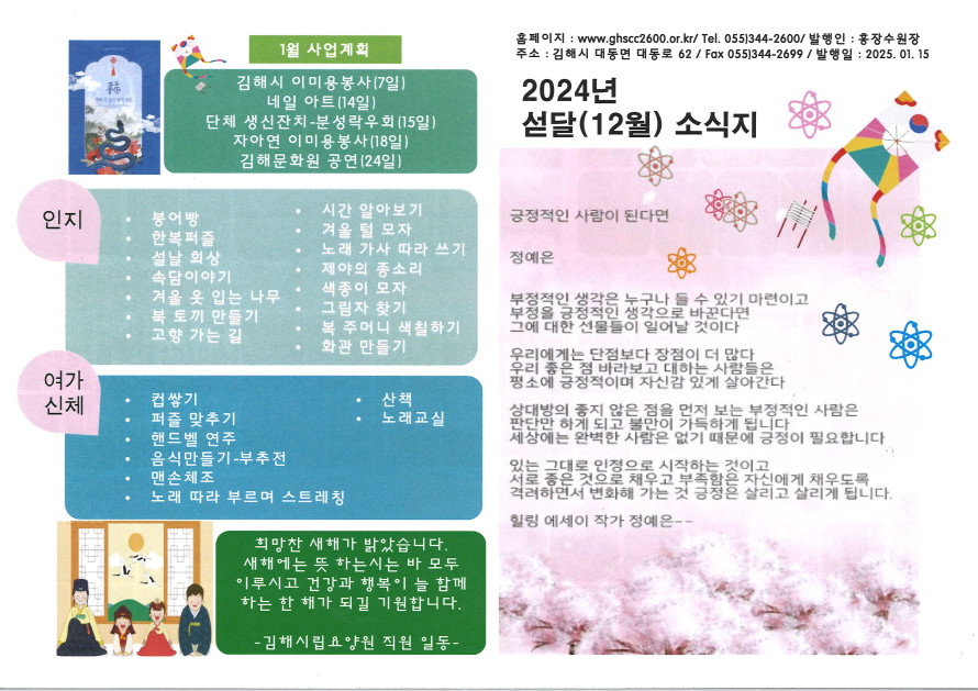 2024년 섣달(12월) 소식지 작성자 관리자 댓글 0건 조회 207회 작성일 25-01-15 08:59 본문 2024년 섣달(12월) 소식지 목록 이전글김해시립주간보호센터 25년 1월 소식지 25.01.31 다음글2024년 들겨울달(11월) 소식지 24.12.16
