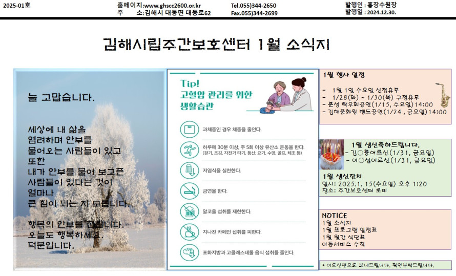 김해시립주간보호센터 25년 1월 소식지 작성자 관리자 댓글 0건 조회 224회 작성일 25-01-31 15:01 본문 김해시립주간보호센터 25년 1월 소식지 목록 이전글김해시립주간보호센터 25년 2월 소식지 25.01.31 다음글2024년 섣달(12월) 소식지 25.01.15