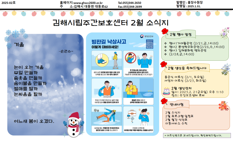 김해시립주간보호센터 25년 2월 소식지 작성자 관리자 댓글 0건 조회 181회 작성일 25-01-31 15:01 본문 김해시립주간보호센터 25년 2월 소식지 목록 이전글2025년 한밝달(1월) 소식지 25.02.14 다음글김해시립주간보호센터 25년 1월 소식지 25.01.31