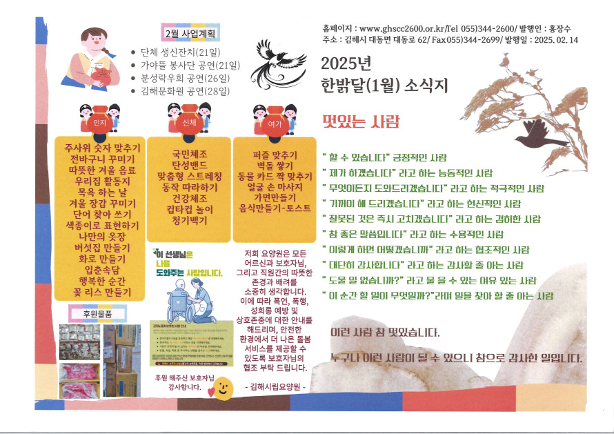2025년 한밝달(1월) 소식지 작성자 관리자 댓글 0건 조회 161회 작성일 25-02-14 11:49 본문 2025년 한밝달(1월) 소식지 목록 이전글2025년 들봄달(2월) 소식지 25.03.14 다음글김해시립주간보호센터 25년 2월 소식지 25.01.31