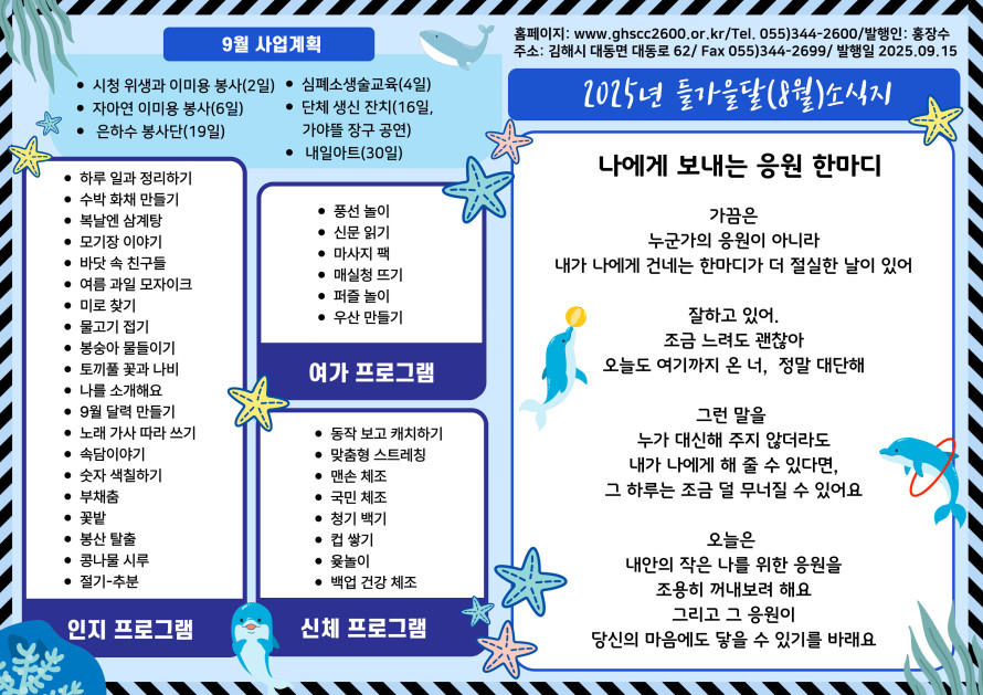 2025년 들가을달(8월) 소식지 작성자 관리자 댓글 0건 조회 74회 작성일 25-09-15 11:16 본문 2025년 들가을달(8월) 소식지 목록 이전글2025년 온가을달(9월) 소식지 25.10.15 다음글2025년 더위달(7월) 소식지 25.08.13