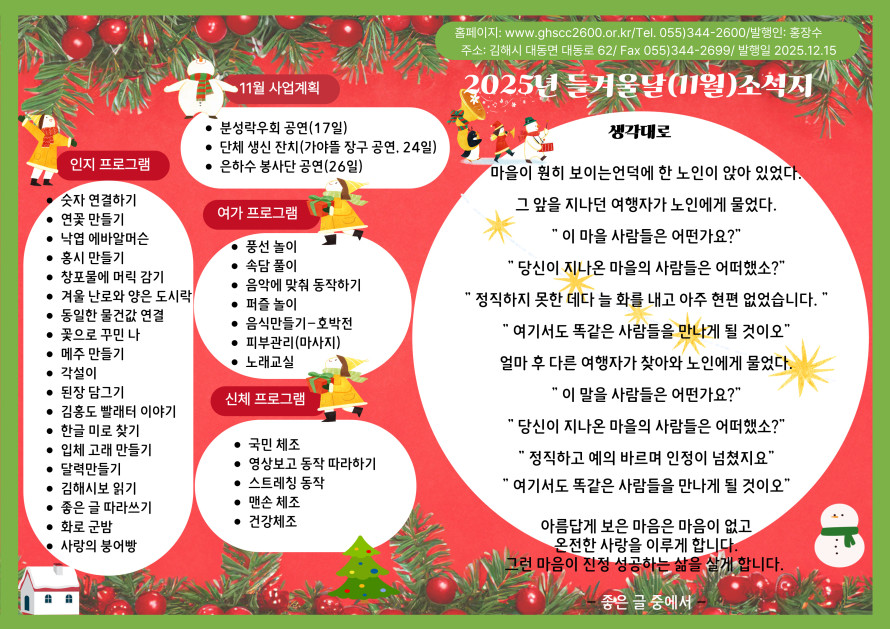 2025년 들겨울달(11월) 소식지 작성자 관리자 댓글 0건 조회 28회 작성일 25-12-15 11:02 본문 2025년 들겨울달(11월) 소식지 목록 이전글2025년 섣달(12월) 소식지 26.01.14 다음글2025년 열달(10월) 소식지 25.11.17