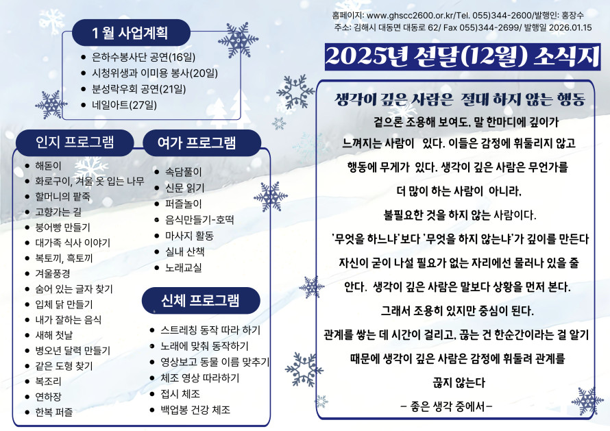 2025년 섣달(12월) 소식지 작성자 관리자 댓글 0건 조회 22회 작성일 26-01-14 15:52 본문 2025년 섣달(12월) 소식지 목록 이전글김해시립주간보호센터 26년 1월 소식지 26.02.09 다음글2025년 들겨울달(11월) 소식지 25.12.15