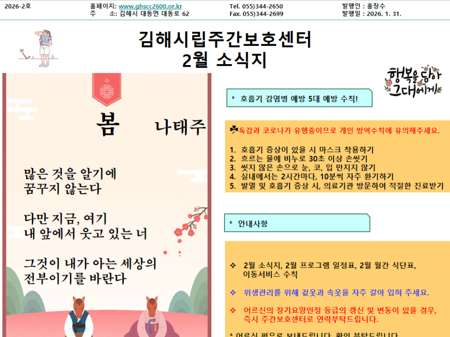 김해시립주간보호센터 26년 2월 소식지 작성자 관리자 댓글 0건 조회 13회 작성일 26-02-09 13:38 본문 김해시립주간보호센터 26년 2월 소식지입니다. 목록 이전글2026년 해오름달(1월) 소식지 26.02.13 다음글김해시립주간보호센터 26년 1월 소식지 26.02.09