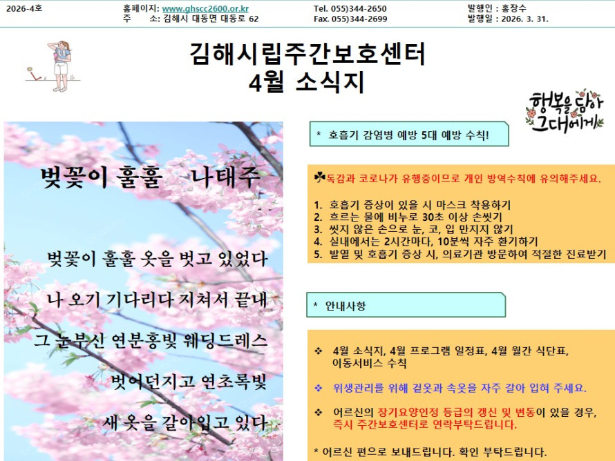 김해시립주간보호센터 26년 4월 소식지 작성자 관리자 댓글 0건 조회 4회 작성일 26-04-03 17:53 본문 김해시립주간보호센터 26년 4월 소식지입니다. 목록 다음글2026년 시샘달(2월) 소식지 26.03.13